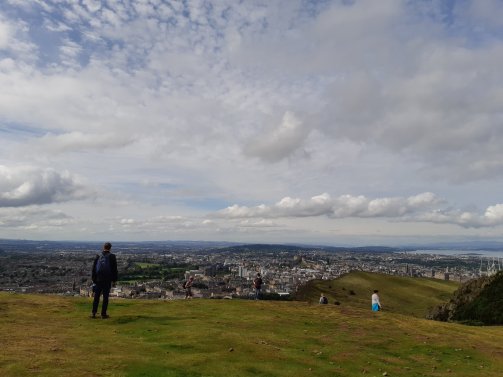 We walked eastwards via the Meadows towards the foot of a dormant volcano. Looking online we saw that there were many routes to get up to the top, the first route we took would have led up to essentially a zig zag rocky ladder, so we walked around Hunter’s Bog towards the Palace of Holyrood and saw the ruined St Anthony’s chapel. We followed some people and walked up another path towards the summit, but this turned out to be very rocky as well, just not as steep. I think there was another path that we were meant take that was shallower but we missed this route. It was a struggle for me, that’s for sure, I was very tired when we got to the top.