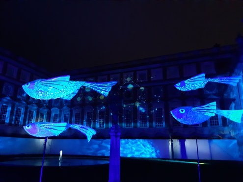 We walked onwards to Fountain Court, where blue wave-like lights projected an underwater tunnel. There were large fish “swimming” or “floating” beside us as we walked along the tide, listening to music replicating trickles of water and fountains. Projected on the palace walls were shooting stars too.