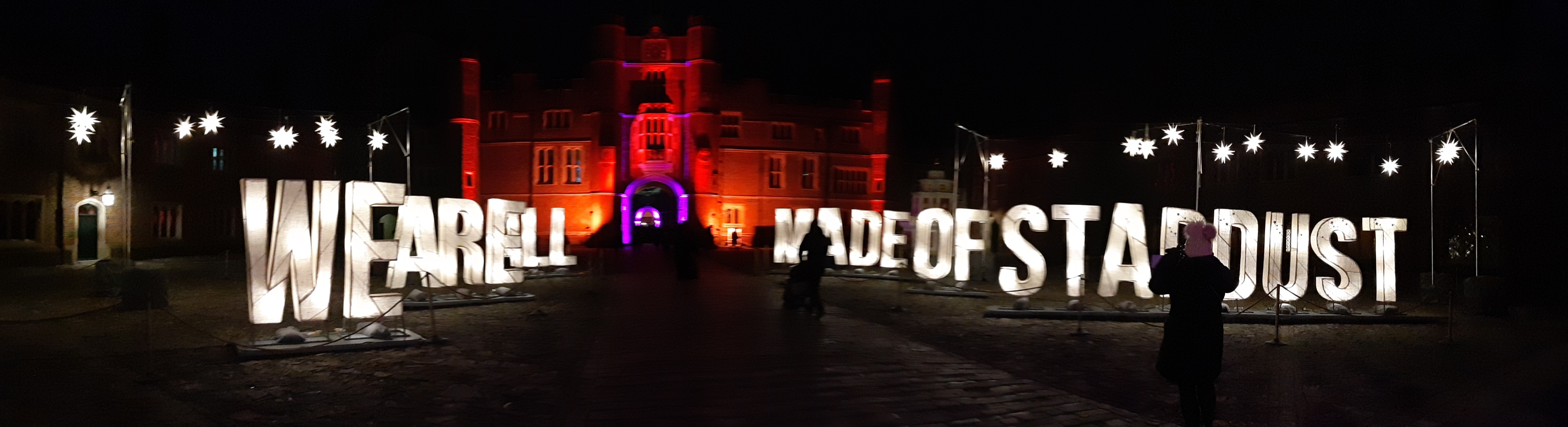 We had our tickets scanned and walked through the West Gate into the Base Court, where the words We are all made of stardust lit before us. Stars were lit too and music was playing – it was magical.